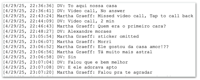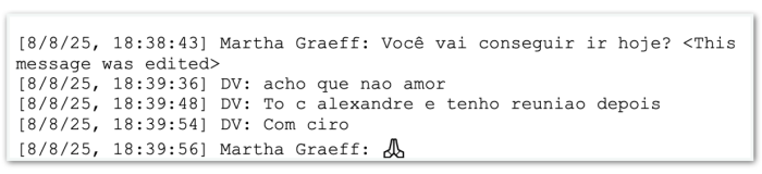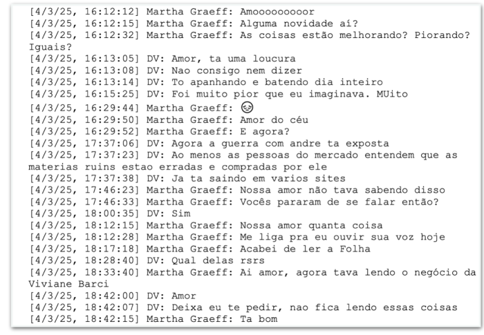No dia 19 de abril de 2025, um sábado, Vorcaro informa Martha